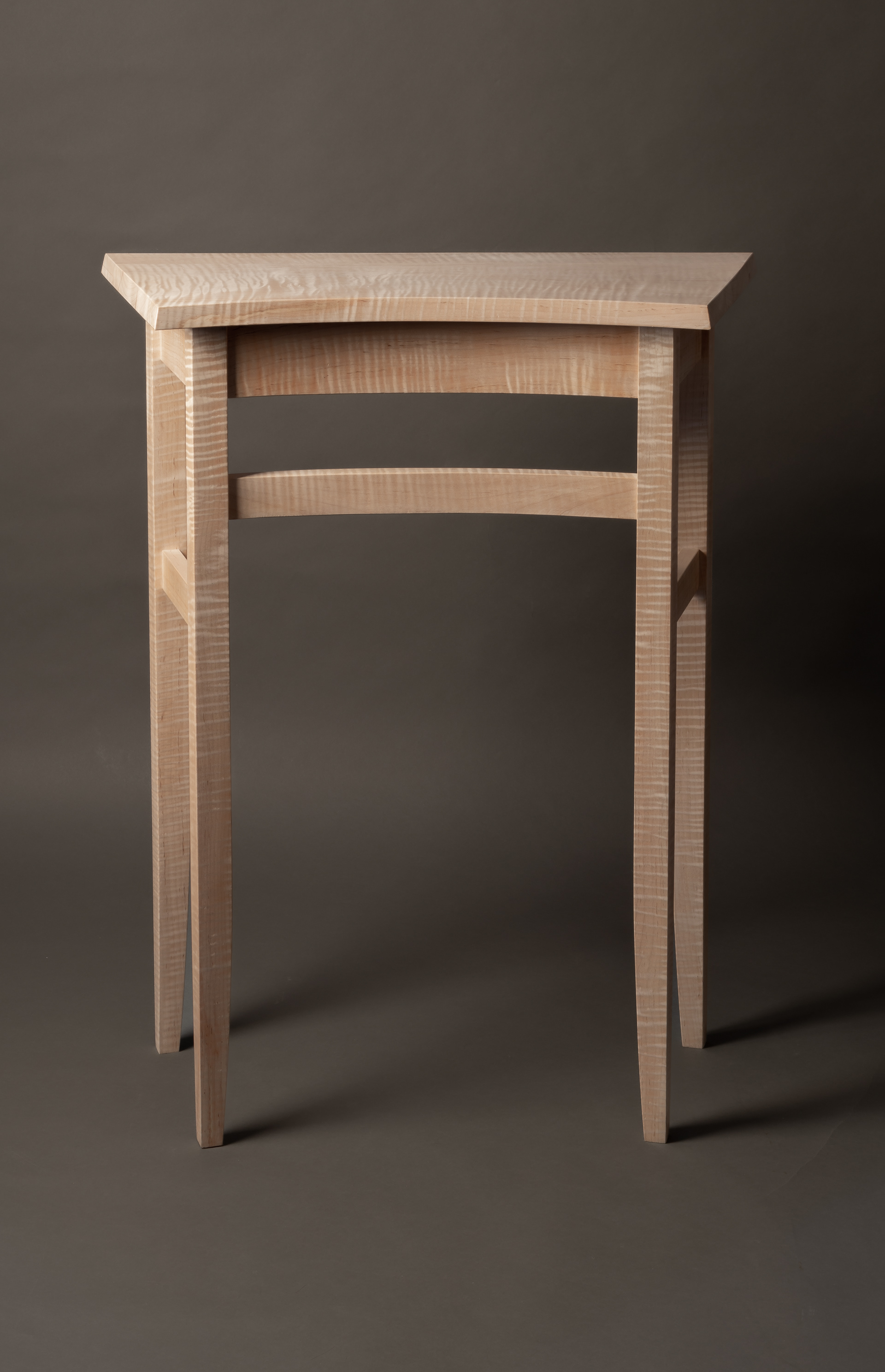 Entry Table made from very figured maple. I had this plank, and really didn't want to piece it out for other projects. The figure in this wood is too strong to be a part of something else, it works better keeping to itself. Its unusual for the figure to evenly wrap around all four sides of each of the legs. The other unusual feature is how evenly white the wood was while I was working it. Maple always darkens towards yellow when it is finshed. So I decided no stain, no finish, hand planed surface. I used a very neutral (Renaissance) wax on the top. The color is really variable depending on the direction of the light.