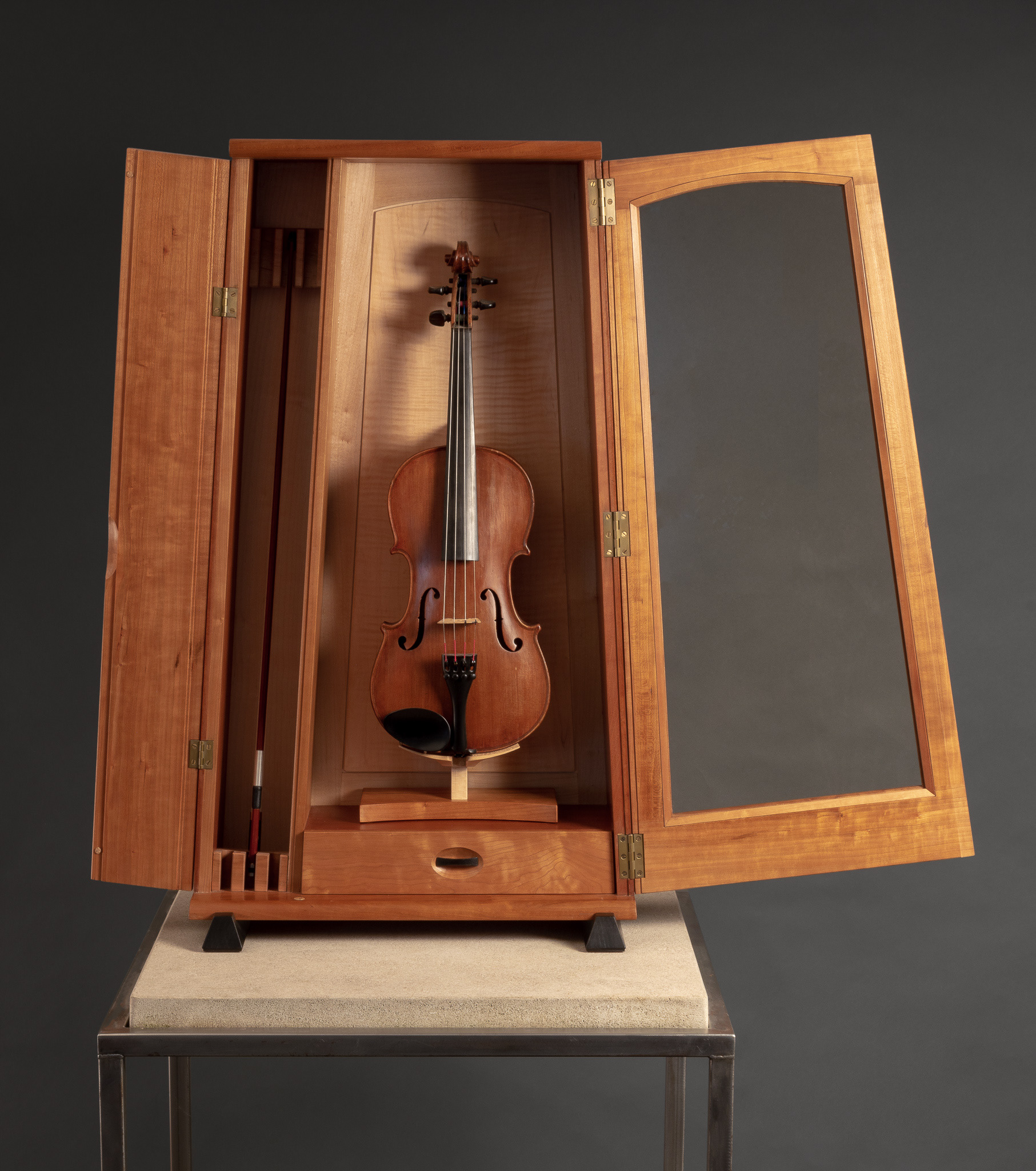 The cabinet is made to house a violin or viola and accessories. The instrument stand is separate and can be removed from the case