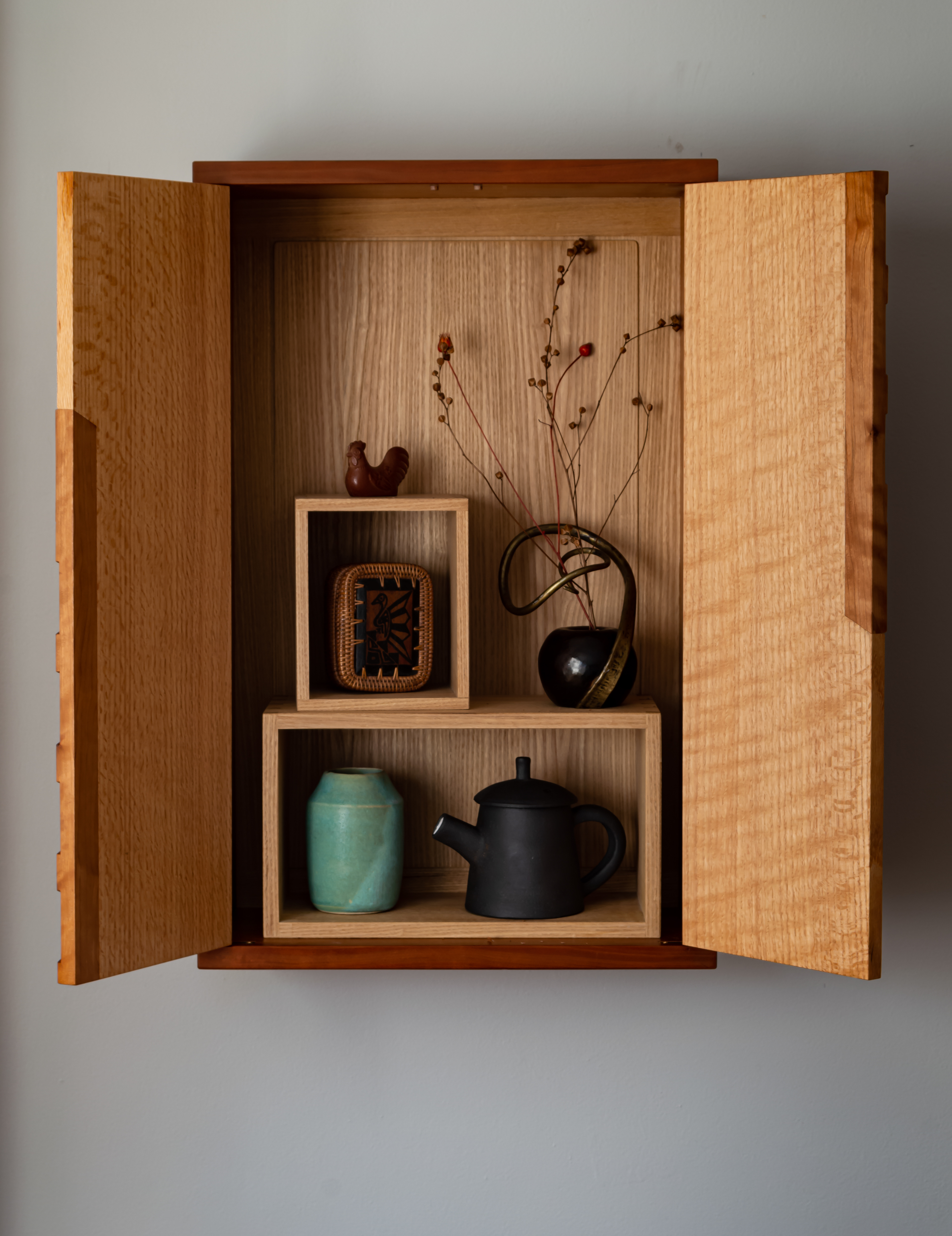 Wall Cabinet made from cherry, figured red oak, and sassafras. This was a therapy piece made at the beginning of the pandemic. The idea for the door pulls is similar to interlaced pulls I made for a previous maple cabinet. These were geometric, and done with a Japanese handsaw and chisel. I decided to carry the pattern to the sides, which I felt would better connect with the front. I wanted to try something different for the inside instead of the usual shelves or drawers, and instead made a series of different size rectangular boxes or platforms, that could be arranged in different ways. The platforms and frame and panel back are made of sassafras, left unfinished.